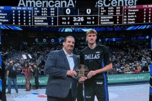 体育资讯12月7日讯 独行侠主场迎战火箭,状元弗拉格赛前领取月最佳新秀奖。