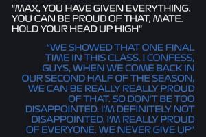 维斯塔潘:我们在最后一站展现了自己的水平。说实话,伙计们,当我们下半赛季反扑时,我们真的真的可以为此感到无比自豪。所以别太失望,我一点也不失望。我真的为每个人感到骄傲。我们永不放弃。
