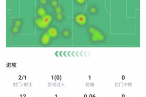 射门2次射正1次,尝试过人1次,丢失球权12次,约为1次,预期进球0.06球