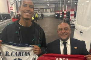 体育资讯11月5日讯 在利物浦结束与皇马的欧冠较量后,红军队长维范戴克在社交媒体上晒出与皇马传奇左后卫罗伯托-卡洛斯的合影,两人并互换了球衣。
