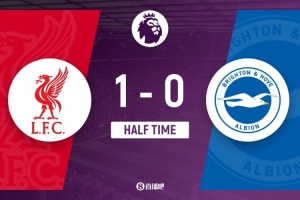 伤停补时3分钟。上半场比赛结束,利物浦1-0布莱顿。
