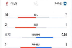 体育资讯12月13日讯 英超第16轮,利物浦主场对阵布莱顿,利物浦半场1-0领先,两队上半场数据如下(主队利物浦在前):
