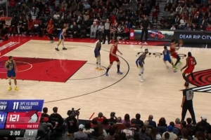 场边库里看高兴了!小佩顿外线连中两记三分球 勇士领先19分打停
