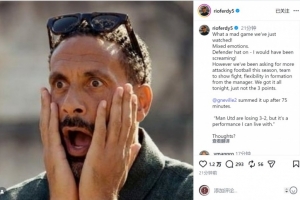 曼联名宿费迪南德社媒晒出自己一脸惊讶的照片,并写道:“我们刚刚看了一场多么疯狂的比赛!心情复杂。以防守球员的身份来说——我(要是还在场上)肯定会大喊大叫!”