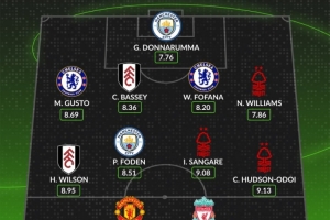 中场:哈里·威尔逊(富勒姆)、福登(曼城)、桑加雷(诺丁汉森林)、奥多伊(诺丁汉森林)