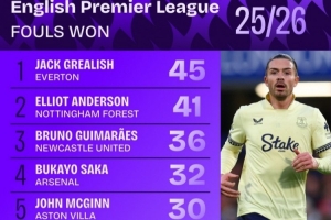 体育资讯12月19日讯 数据机构squawka统计了本赛季英超造犯规次数榜,被曼城外租的格拉利什居首。