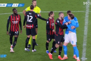 体育资讯12月19日讯 意大利超级杯半决赛,那不勒斯对阵米兰。82分钟,麦克托米奈争抢被吹犯规,随后继续带球,托莫里大脚踢飞皮球撞到麦克托米奈,两人发生争执。最后,两人均吃到黄牌。