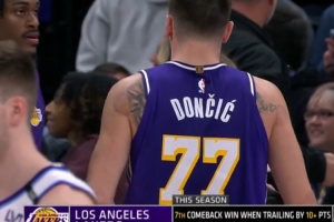 本场比赛,湖人最多落后10分,这是他们本赛季第七次在落后10+的情况下逆转取胜,联盟第二多。