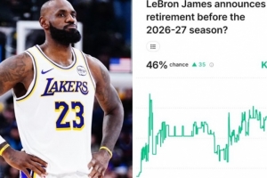 体育资讯12月24日讯 据美媒Kalshi Sports预测,最新消息显示,勒布朗·詹姆斯有46%的可能性在下个赛季开始前宣布退役。他是否会不进行告别巡演就直接退役呢?