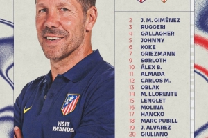 前锋:7-格列兹曼、9-瑟尔洛特、11-阿尔马达、19-阿尔瓦雷斯、20-朱利亚诺-西蒙尼、22-拉斯帕多里、23-尼古拉斯-冈萨雷斯