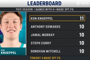 在今天黄蜂客场120-105击败魔术的比赛中,克尼佩尔首节三分4投全中单节轰16分,但第二节不慎崴脚离场,没有再回到比赛,没能再刷新这一数据。