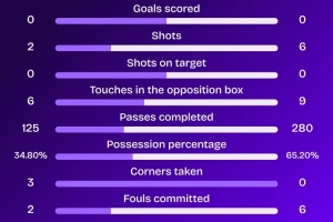 上半场曼城射门6次,射正0次,据Squawka统计,曼城2025年首次英超上半场比赛0射正。
