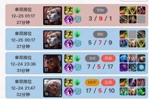 体育资讯12月28日讯 根据排位统计小程序显示,BLG上单Bin近日在韩服狂玩狼母和亚恒。