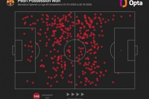 体育资讯12月29日讯 2025年即将结束,opta数据统计显示佩德里是本年度夺回球权次数最多的五大联赛非门将球员。