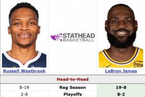 生涯至今,威少常规赛面对詹姆斯为8胜19负,季后赛为2胜8负。