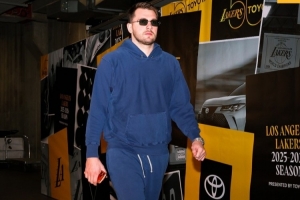 赛前,湖人官方社媒晒出球员入场照,东契奇戴墨镜帅气,老詹吨吨桶傍身。
