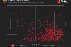 18岁的巴萨右边锋亚马尔在今年各项赛事共计524次尝试过人,285次成功过人是为五大联赛球员同期最多。