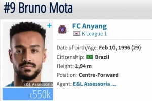 现年29岁的巴西前锋莫塔,2025年初加盟K联赛安养,2025赛季共出战37场,贡献14个进球和3次助攻。