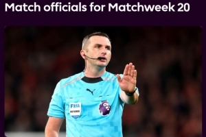 体育资讯12月30日讯 英超官方公布联赛第20轮各场裁判,奥利弗将执法曼城vs切尔西。