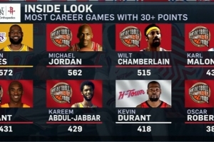 火箭主场迎战步行者,转播方晒出历史30+场次排名,杜兰特418场排名第七。