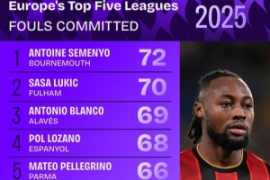 体育资讯1月1日讯 Squawka统计2025年五大联赛球员犯规次数榜,塞梅尼奥72次居首。