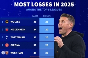 体育资讯1月1日讯 2025年已经结束,《转会市场》也统计了本年度五大联赛输球场次最多情况,前五有3支英超球队。