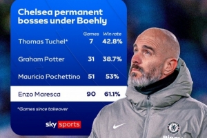体育资讯1月2日讯 切尔西正式官宣马雷斯卡离任。自从伯利执掌切尔西以来,球队已迎来了4任主帅。据天空体育数据统计,在伯利时代的4任主帅中,马雷斯卡的胜率最高,达61.1%。