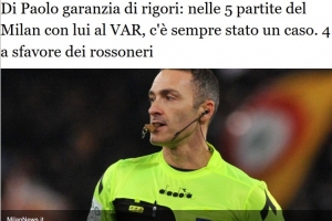 一项引人关注的统计数据,在本赛季由迪保罗作为VAR裁判执法的米兰比赛中,总是会出现点球判罚。