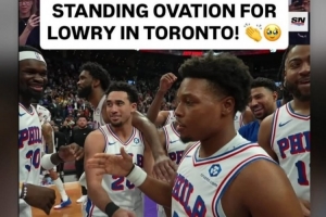在本场比赛的最后垃圾时间,76人后卫洛瑞在猛龙主场球迷的欢呼声中上场,并得到了致敬。