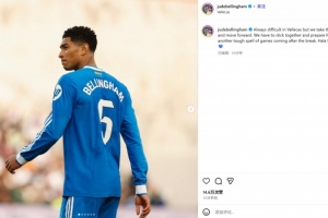 贝林厄姆晒出自己的比赛照,并配文:“客战巴列卡诺总是很艰难,但我们拿到了一分并继续向前看。我们必须团结一致,为国家队比赛周之后的又一轮密集赛程做好准备。马德里前进!”