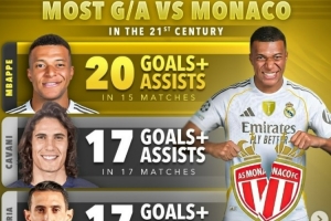 据统计,姆巴佩在面对老东家摩纳哥的15场比赛中已经直接参与20球,在21世纪对阵摩纳哥参与进球(进球+助攻)榜上位居第一,具体榜单如下: