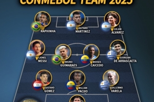 体育资讯1月27日讯 iffhs(注:iffhs即国际足球历史和统计联合会,International Federation of Football History and Statistics)选出南美2025年最佳阵容,梅西、拉菲尼亚等球员入选。