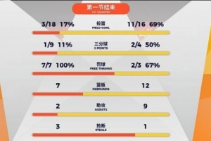 首节比赛,山东全队进攻端毫无状态,内外线都不在线,各种打铁频出,命中率低到离谱:投篮18投仅3中,三分更是仅9中1。