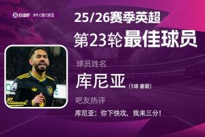 库尼亚最终得到了吧友们15万8652张投票,当选【体育资讯X咪咕体育英超第23轮最佳球员】。
