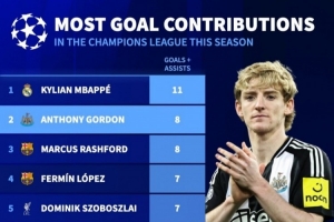 体育资讯1月29日讯 欧冠联赛阶段最后一轮比赛即将开赛,德国转会市场盘点了参加欧冠球员参与进球数,姆巴佩11球居首,戈登、拉什福德8球位居次席。