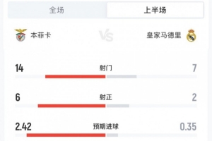 体育资讯1月29日讯 欧冠联赛阶段第8轮,本菲卡主场对阵皇马,半场主队2-1领先,两队半场数据如下(本菲卡在前):